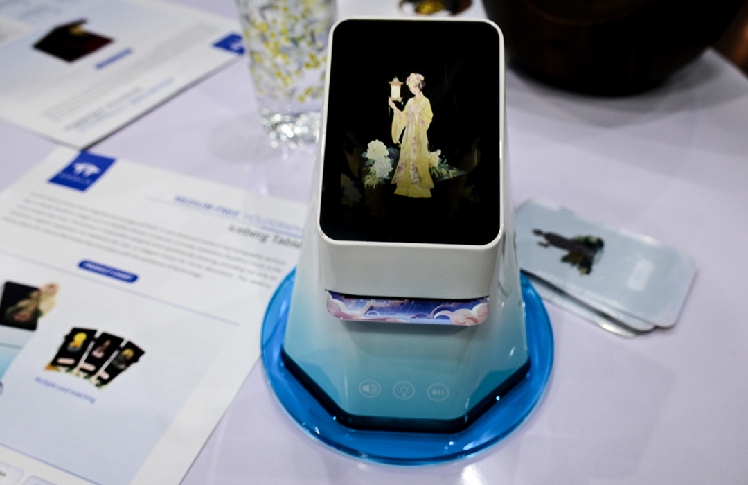 多功能空中成像桌摆成为参展展品中的“流量担当”,现场观众可直观欣赏到空中全息戏曲、文创艺术影像等内容,通过插入相应内容卡片,可迅速读取并播放卡片内容信息,带来全新的视觉与操作体验。