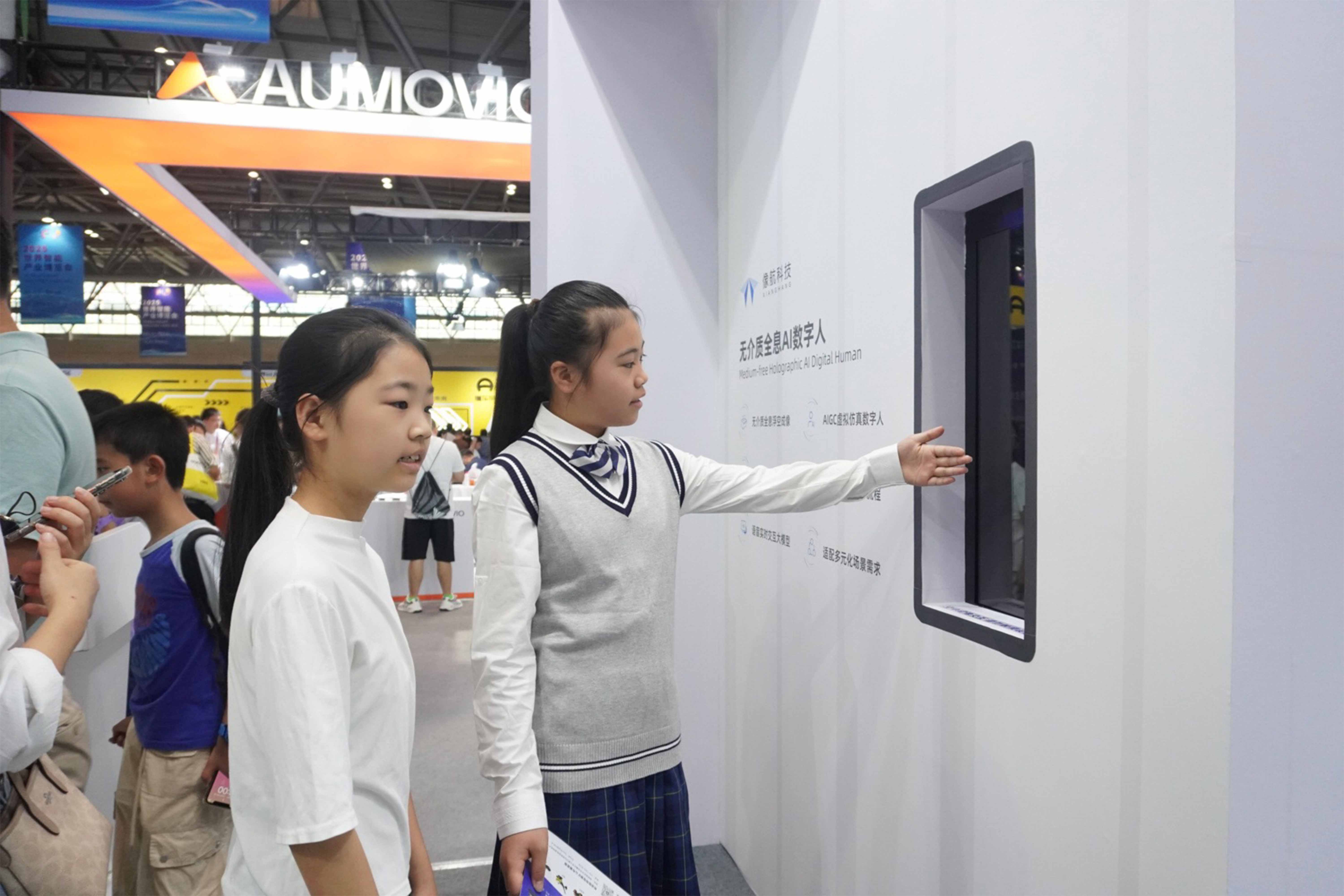 作为大尺寸成像的代表作,无介质全息 AI 数字人融合语音交互大模型,具备成像尺寸大、清晰度高、立体感强及虚拟人形象定制等优势,引发现场观众热议,尤其“小观众们”对“悬浮在空中的屏幕”兴趣浓厚,纷纷伸手尝试隔空操控。