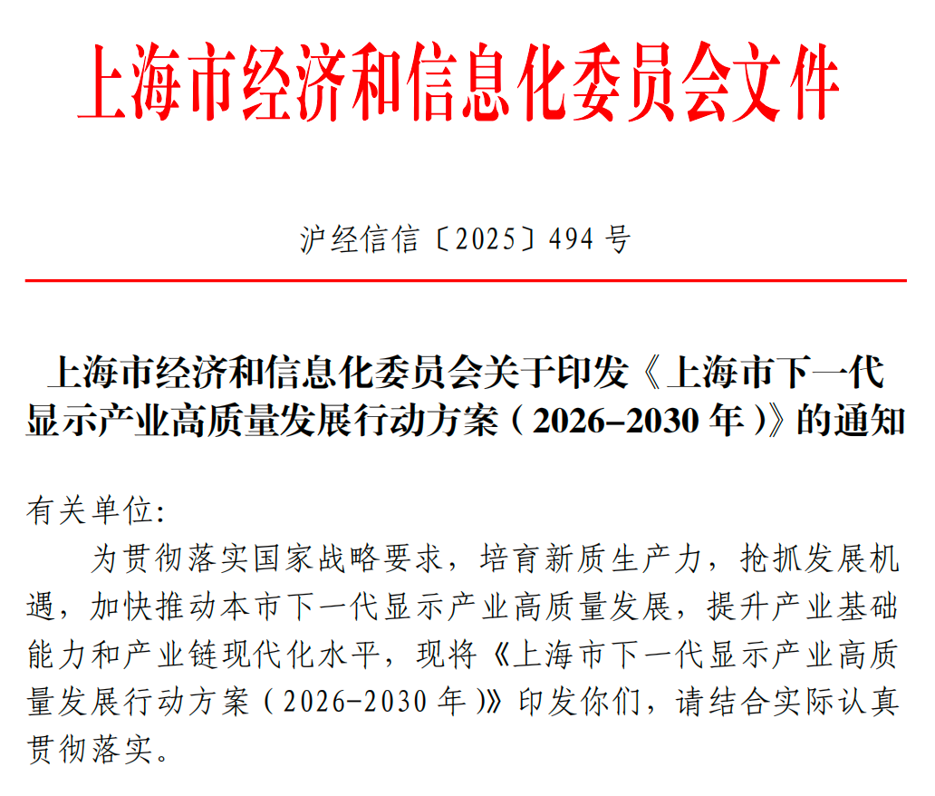 近期,上海市经济和信息化委员会正式发布《上海市下一代显示产业高质量发展行动方案(2026-2030年)》(以下简称《方案》)。